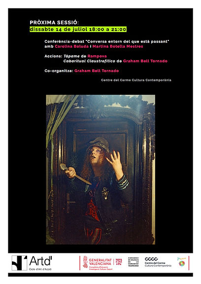 En la sisena sessió de cicle Art D' comptarem amb la presència de Carolina Boluda (Brussel·les, 1966) i Martina Botella Mestres (1973), que presentaran una conferència-debat titulada "Conversa entorn del que està passant". També tindrem el plaer de comptar amb dues propostes en viu: Tápame de Rampova (1956, València) i Cabaritual Claustrofílico de Graham Bell Tornado (1966, Escòcia) qui, a més, co-organitza la sessió.
